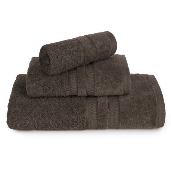 Elegancki ręcznik z delikatnej i bardzo chłonnej tkaniny frotte, jednokolorowy. Krawędzie zdobione subtelną bordiurą z welwetu. Łatwy w praniu, trwałe kolory. szerokość: 30 cm, długość: 50 cm, kolor: brązowy, Gramatura: 500 GSM, Skład: 100% bawełna