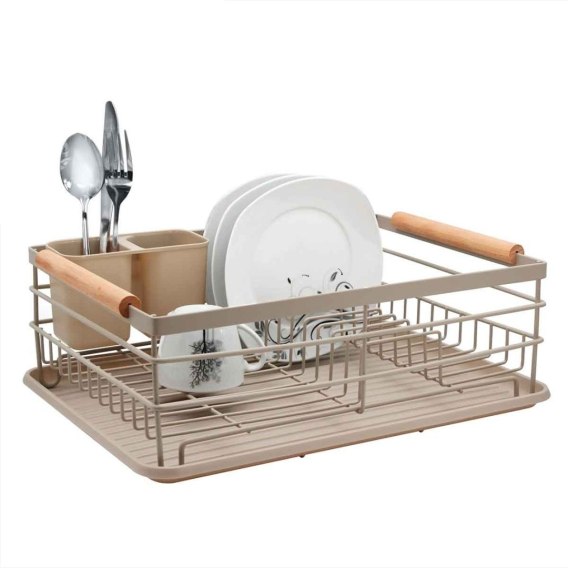 Suszarka do naczyń Brunbeste została zaprojektowana z myślą o codziennej wygodzie w kuchni. Dzięki metalowej ramie malowanej proszkowo jest niezwykle odporna na rdzę i zarysowania. Suszarka posiada eleganckie drewniane uchwyty. Tacka pod ramą zabezpiecza blat przed zmoczeniem. Do suszarki dołączony jest dwukomorowy ociekacz na sztućce z tworzywa sztucznego.