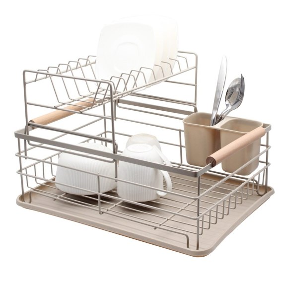 Suszarka do naczyń dwupoziomowa beżowa z ociekaczem na sztućce i tacą
