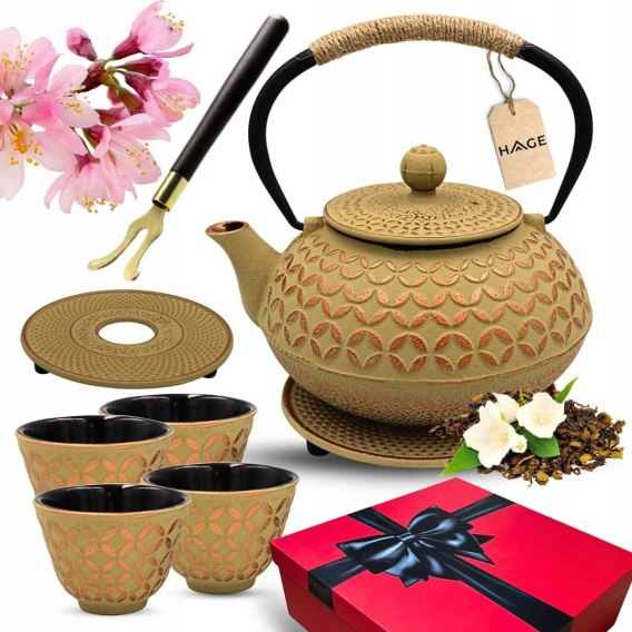 ZAPARZACZ ŻELIWNY DZBANEK JASNY ZŁOTY 900ml Z FILTREM i FILIŻANKAMI