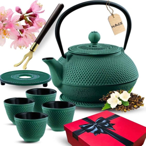 Żeliwo doskonale zatrzymuje ciepło, a emaliowana powłoka ułatwia utrzymanie czystości i poprawia estetykę. Czajnik wyposażony jest w ergonomiczny uchwyt oraz pokrywkę, a w zestawie znajdują się czarki, które umożliwiają komfortowe picie herbaty.