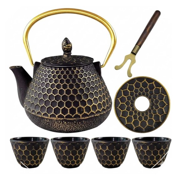 Żeliwo doskonale zatrzymuje ciepło, a emaliowana powłoka ułatwia utrzymanie czystości i poprawia estetykę. Czajnik wyposażony jest w ergonomiczny uchwyt oraz pokrywkę, a w zestawie znajdują się czarki, które umożliwiają komfortowe picie herbaty.