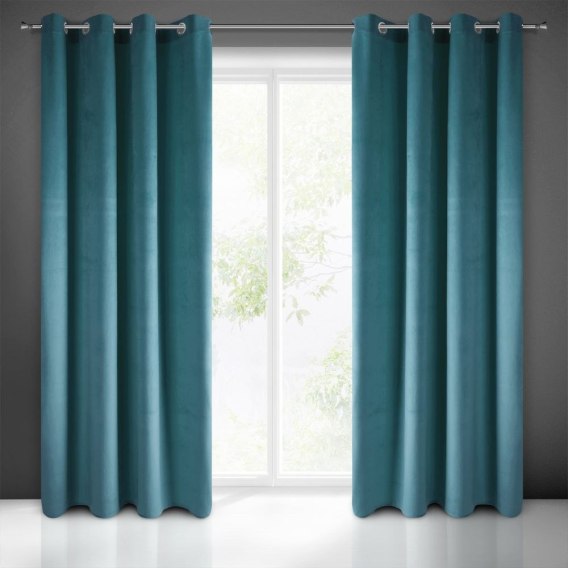Miękka zasłona gotowa z jednokolorowego aksamitu o charakterystycznym dla welwetu połysku.