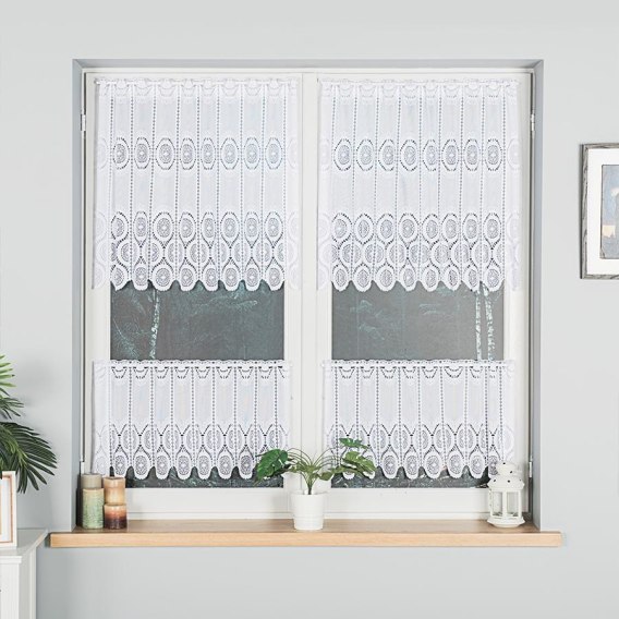 Zazdrostka żakardowa 018535 w kolorze białym to doskonały wybór dla osób ceniących połączenie funkcjonalności i subtelnego stylu. Wykonana z wysokiej jakości tkaniny o składzie 100% poliester, jest trwała, odporna na zagniecenia i bardzo łatwa w pielęgnacji. Delikatny żakardowy wzór nadaje wnętrzu elegancji i przytulnego charakteru, idealnie dopełniając aranżację kuchni, jadalni czy łazienki.