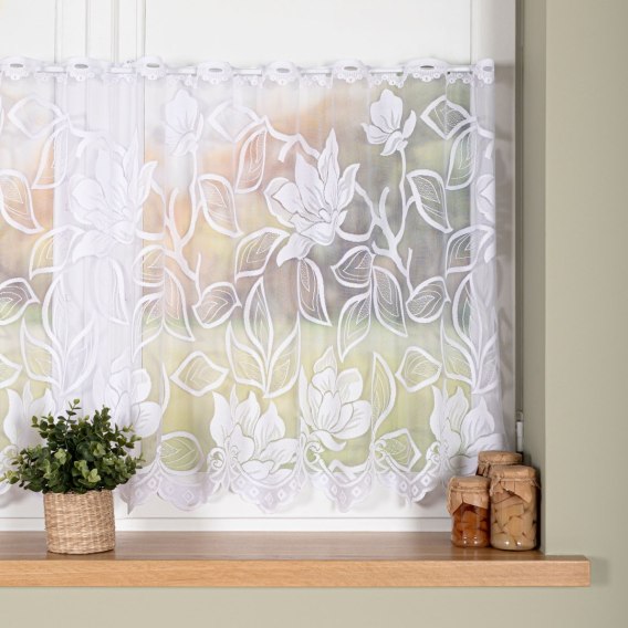 Zazdrostka 023338 subtelnie osłania dolną część okna, zapewniając prywatność, a jednocześnie nie ograniczając dopływu światła dziennego. To praktyczne rozwiązanie szczególnie polecane do kuchni i pomieszczeń, w których jasność wnętrza ma duże znaczenie.